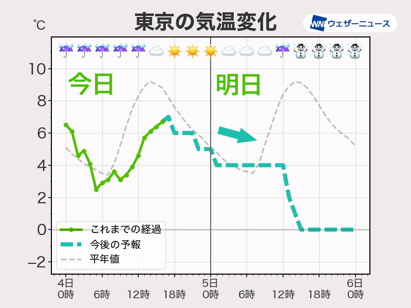 このまま気温が低い状況が続くことで、関東では明日の降水が雪になる可能性が高くなっています。雪が降り始めると気温も体感温度もいっそう下がるため、真冬以上の防寒が必須です。