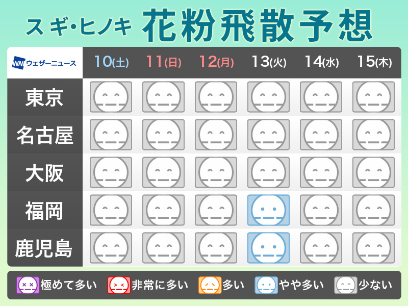 気温が上がり日差しの届く13日(火)から14日(水)にかけて特に注意が必要で、福岡など西日本では13日(火)の花粉飛散予想が「やや多い」ランクです。