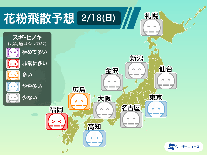 花粉の飛散量は、福岡や熊本などの九州、山口では「非常に多い」予想のところがあります。広島や松江は「多い」、東京都心でも「やや多い」予想となっており、各地で花粉シーズンを迎えています。