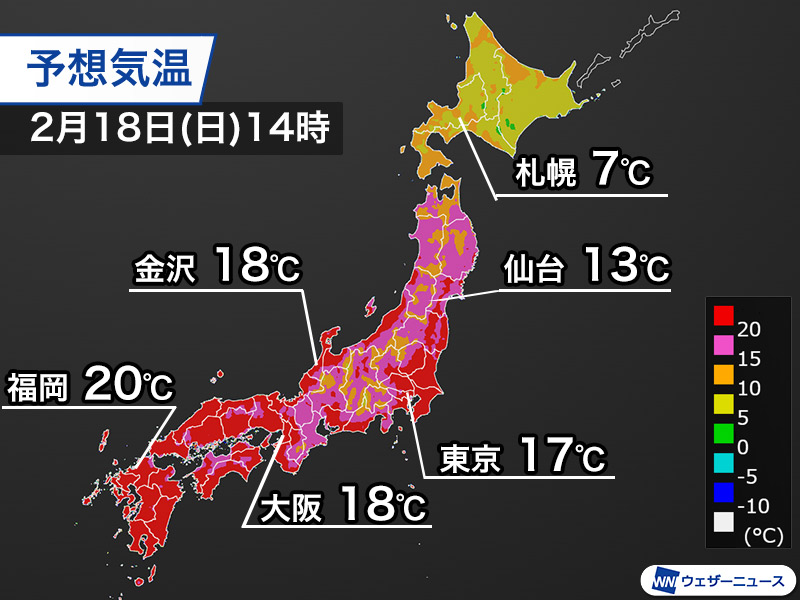 福岡は昨日に比べて6℃も高く20℃予想、高知は19℃、大阪は18℃で、西日本は春本番の陽気となります。