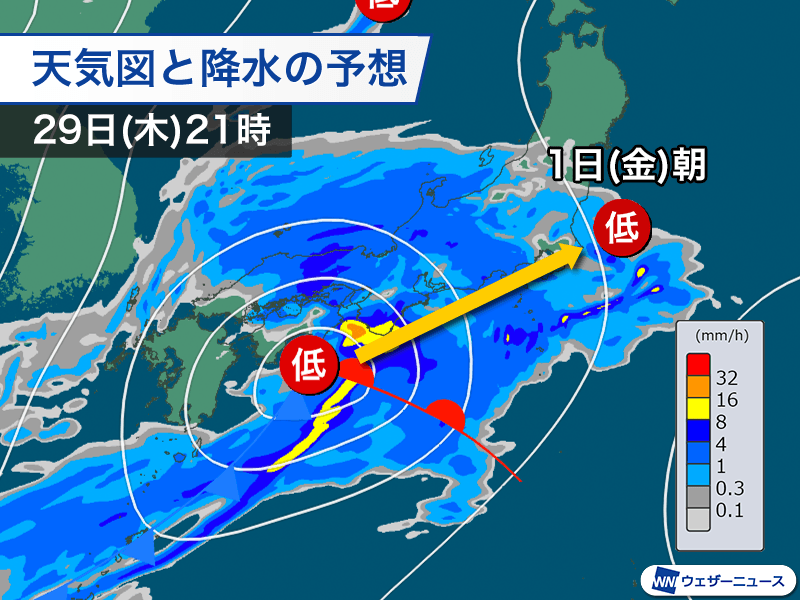 低気圧に向かって暖かく湿った空気が流れ込むため周辺では雨雲が活発になり、近畿や東海では今夜遅く、関東では明日の未明から早朝にかけて局地的に雨の強まる可能性があります。