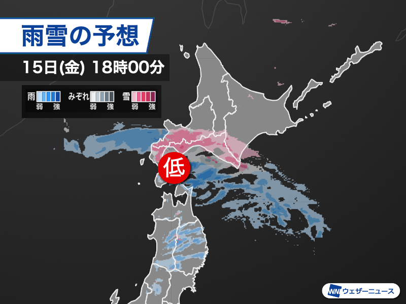 低気圧の北側を中心にまとまった降水となり、北海道の太平洋側では雪や雨の降り方が強まる所がある見込みです。