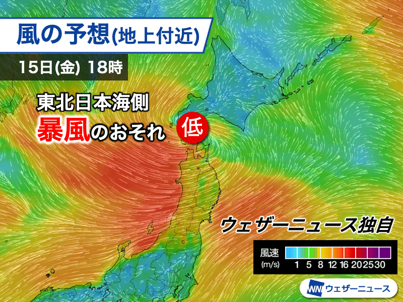 上空に寒気を伴った気圧の谷が接近し、午後は低気圧が急速に発達しながら津軽海峡付近を通過します。西日本から東日本に張り出す高気圧との間で気圧差が大きくなって、東北日本海側を中心に西寄りの風が強まる予想です。すでに山形県の飛島では、平均風速が18m/sを超えています。
