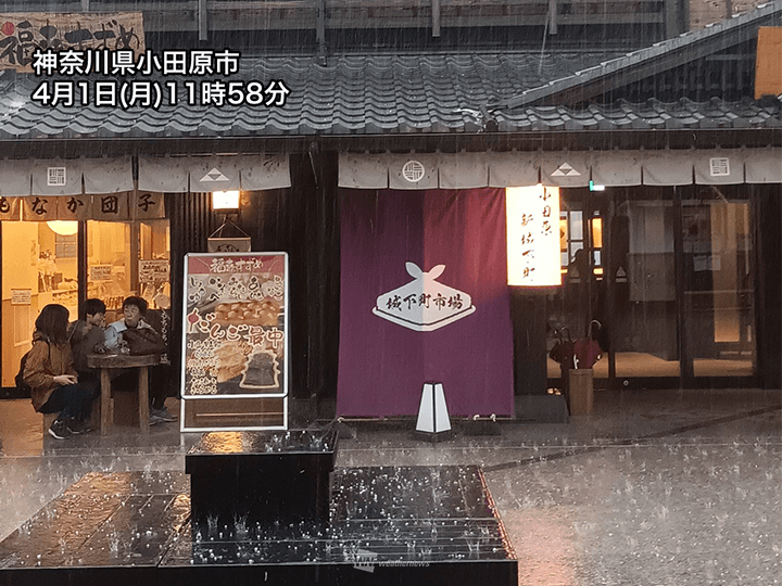 関東の上空5500m付近に−20℃以下の強い寒気が流れ込んでいる影響で、大気の状態が不安定になっています。シアーライン(風の流れが変化する境界線)の周辺で雲が急速に発達していて、特に神奈川県内に活発な雨雲が広がってきました。