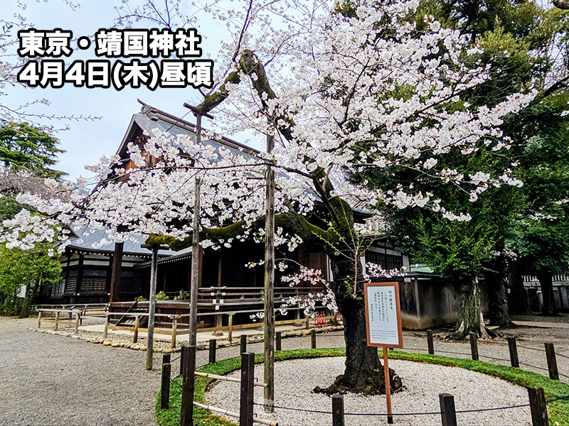 3月下旬に寒の戻りがあったため平年より遅い3月29日となった東京の桜。開花後は平年より暖かい日が多く開花が順調に進み、開花から約1週間後の今日4月4日(木)に満開を迎えました。