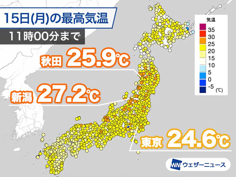 新潟や秋田で午前のうちに夏日到達