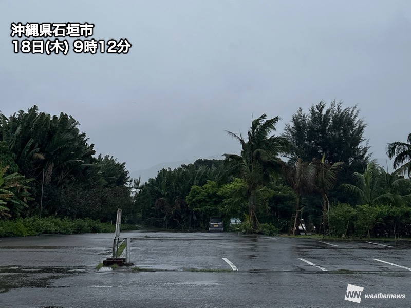 今日18日(木)は沖縄・先島諸島で雨が強く降っています。昼前にかけては石垣島周辺で雷を伴った土砂降りの雨に注意が必要です。午後は天気が回復に向かいます。