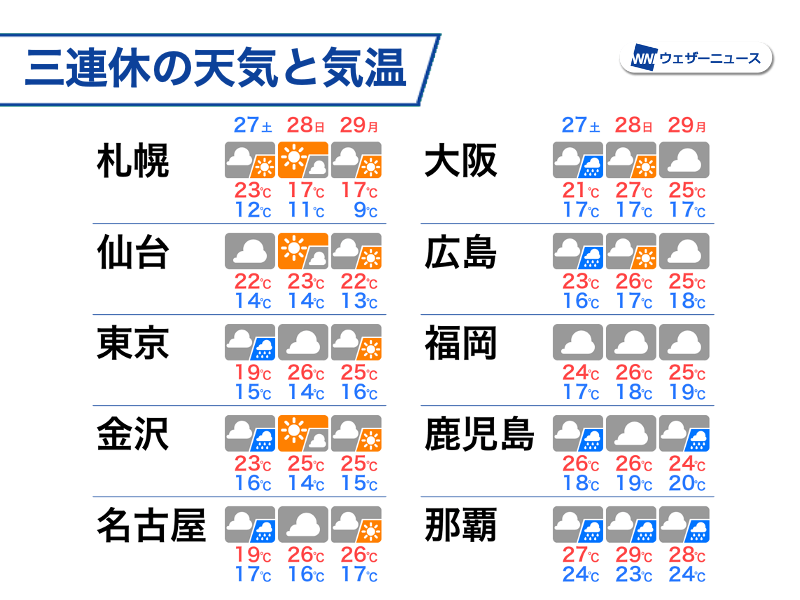 晴れる分、気温が上がり、西日本や東日本を中心に25℃以上の夏日の所が多いとみています。28日(日)の長野市や福島市、山形市は29℃まで上がる予想で、一部では30℃以上の真夏日になる可能性もありそうです。