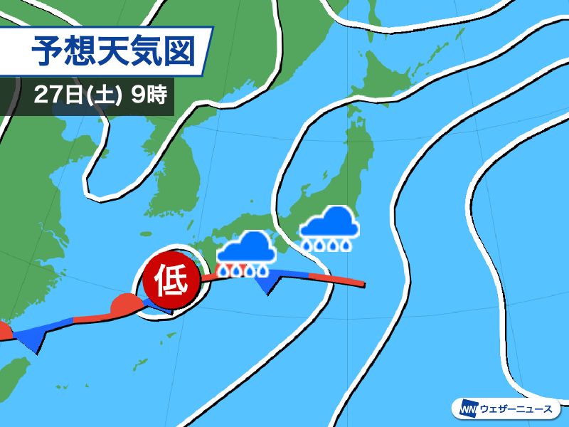 明日25日(木)に南の海上へ離れる前線が、26日(金)午後から27日(土)にかけては再び本州の南岸まで北上傾向です。三連休初日は西日本や東日本の太平洋側を中心に雨が降る予想になっています。