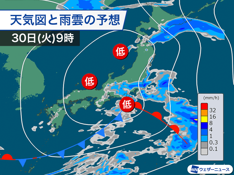明日30日(火)の朝は東海から関東の沖を低気圧が進むため、雨が降りやすくなります。