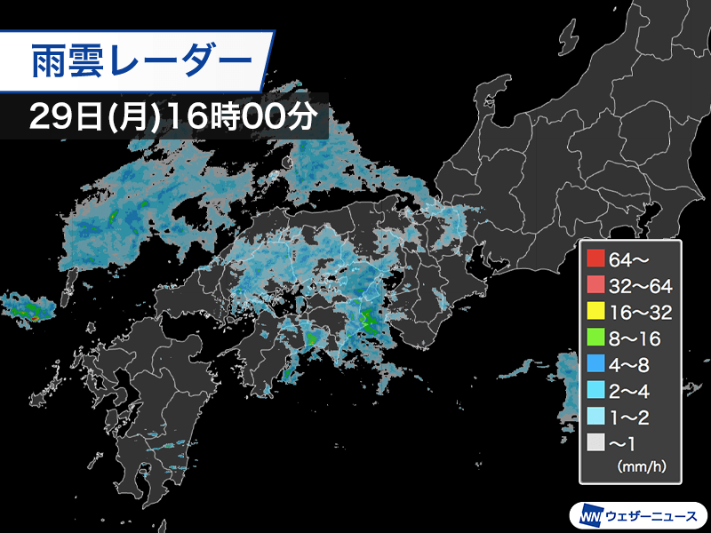 午前中に雨が強まった九州の雨は小康状態になり、中国・四国から近畿へ雨の中心が移ってきました。四国の太平洋側に活発な雨雲がみられ、16時00分までの1時間には徳島県美波町・日和佐で12.5mmのやや強い雨を観測しました。