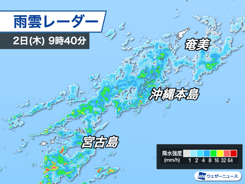 暖かく湿った空気の影響で局地的に雨雲が発達し、石垣市川平(石垣島)では8時40分までの1時間に24.0mmの強い雨を観測しました。9時40分現在は沖縄本島に活発な雨雲がかかり、本部町で1時間に7.0mmの雨を観測するなど、本降りの雨になっています。