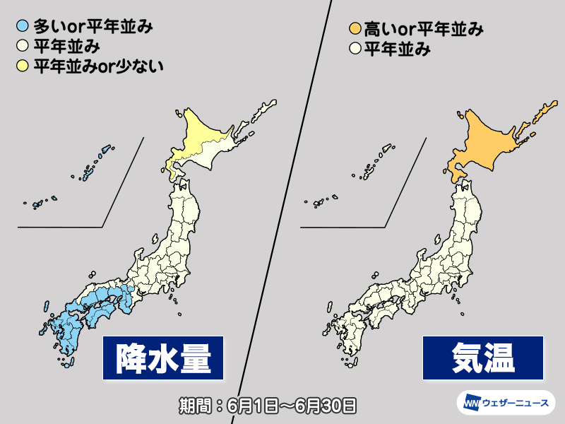 6月の前半は平年並みか低く、後半になると全国的に平年より高めとなる予想になっています。
