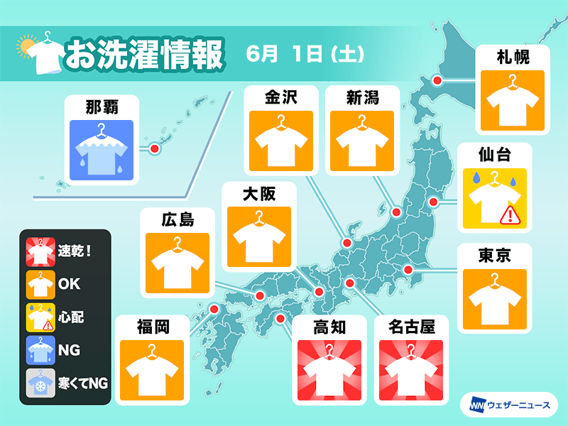 九州から関東は日差しが届いて、広く洗濯物の外干しOKです。関東は夜遅くに雨の可能性があるので、帰りが遅くなる場合は部屋干しが良さそうです。