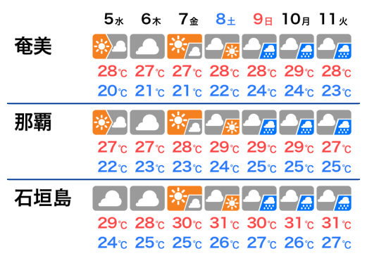 これから8日(土)にかけて梅雨前線は南海上に離れた状態が続きます。沖縄や奄美は晴れまたは曇りの日が続き、梅雨の中休みとなりそうです。
