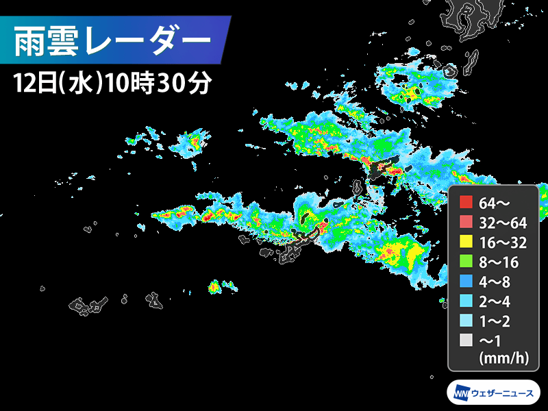 奄美本島の古仁屋では9時30分までの1時間に43mmの激しい雨を観測し、沖縄本島の本部でも34.5mmの雨量を観測しました。10時30分現在、鹿児島県奄美地方と沖縄本島地方には大雨警報が発表されています。