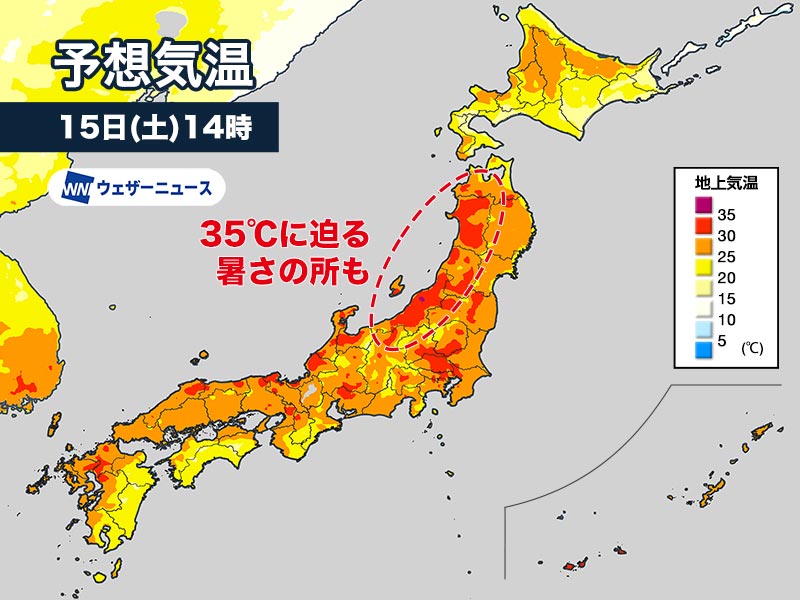 今日6月15日(土)は晴れる東日本や北日本などで気温が高くなります。最高気温が30℃以上の真夏日になるエリアが広がり、新潟や秋田などでは梅雨入り前一番の暑さになる所も。内陸などでは35℃に迫る可能性も。