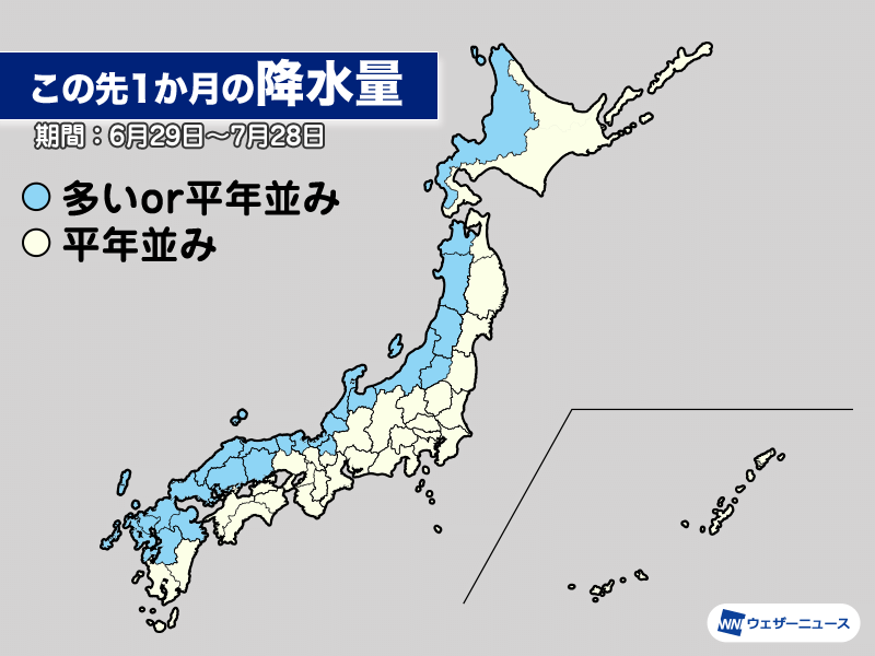 太平洋高気圧の勢力が強いため、梅雨前線は日本海に停滞しやすくなります。暖かく湿った空気が流れ込むことで活動は活発になり、九州から北海道にかけて日本海側の降水量は平年並みか平年よりも多い予想です。