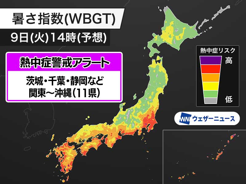 明日9日(火)も関東南部や静岡県、近畿南部、四国、九州太平洋側では強い日差しが照り付けて、体温レベルの危険な暑さが続きます。