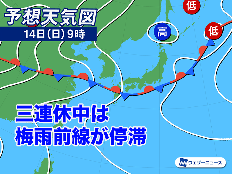 三連休中は梅雨前線が本州付近に停滞し、前線活動が活発になる予想です。