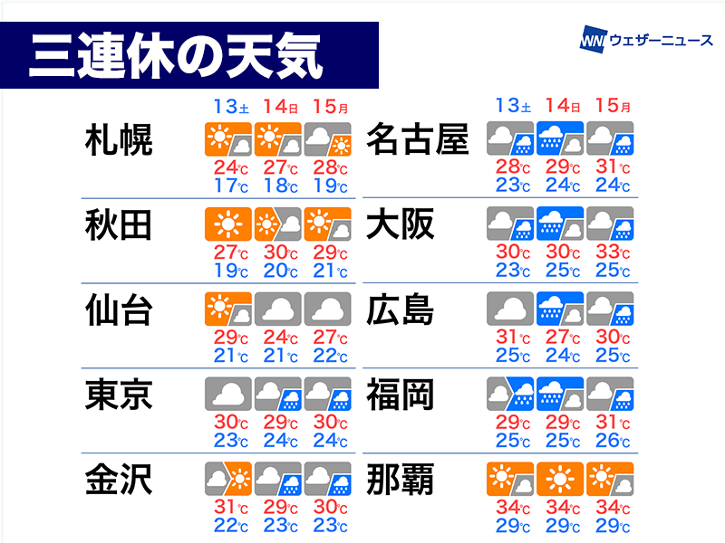 今週末の明日13日(土)から海の日の15日(月)まで3連休となります。西日本や中部では梅雨末期の大雨に注意が必要です。