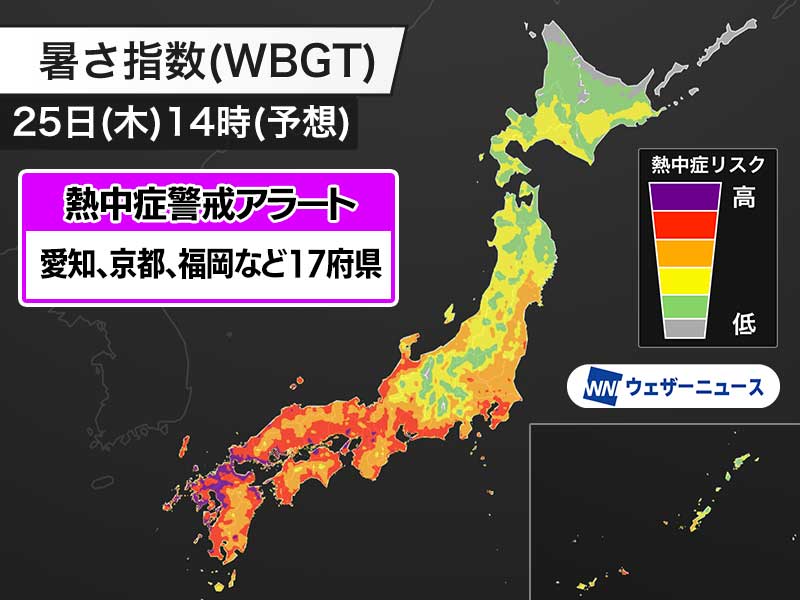 環境省と気象庁は、今日25日(木)を対象とした熱中症警戒アラートを17府県に発表しました。