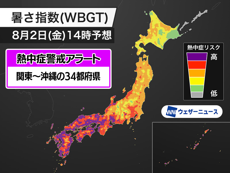 今日8月2日(金)対象の熱中症警戒アラート 関東から沖縄の34都府県に発表