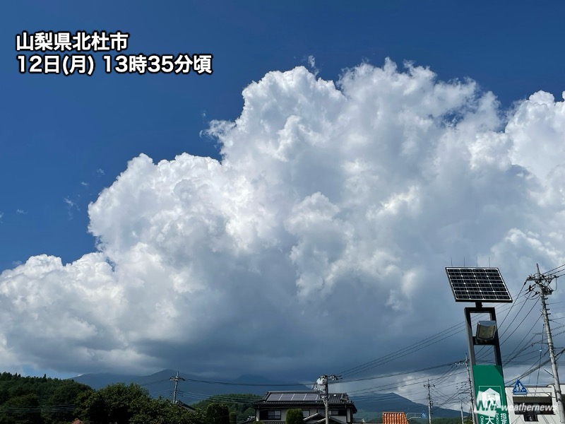 まだ雨雲の発生は局地的ですが、この後は内陸部の広い範囲で雨雲が発生しやすくなる予想です。特に、栃木県や群馬県、山梨県や長野県は、市街地でも急な雷雨の可能性があります。
