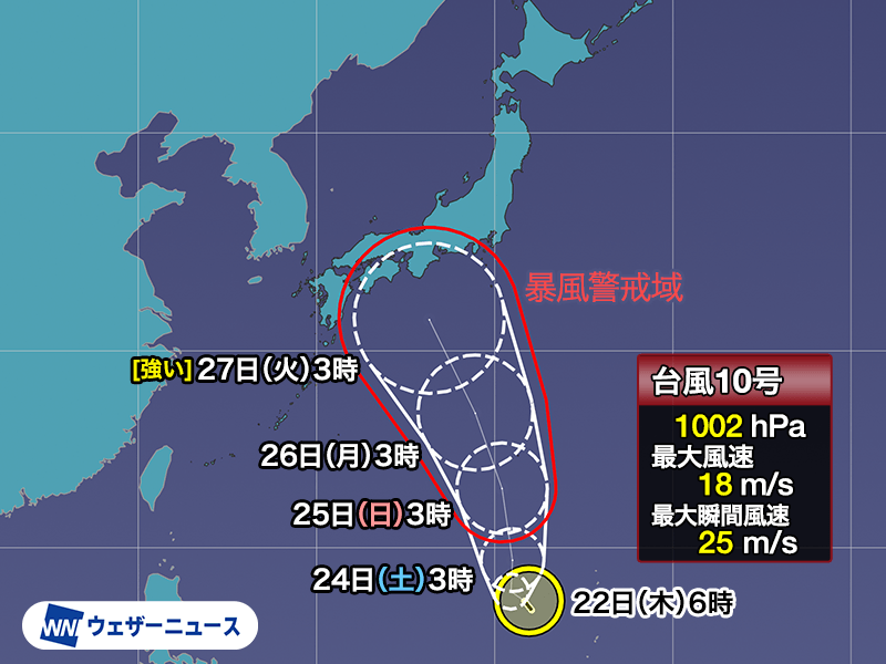 勢力の予想を見ると、台風10号は24日(土)〜25日(日)頃には暴風域を伴う程度に発達し、5日先には「強い」台風になる可能性があります。