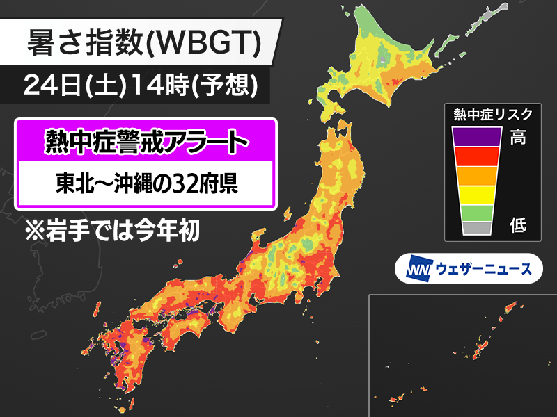 今日8月24日(土)、環境省と気象庁は熱中症警戒アラートを東北〜沖縄の32府県に発表しました。岩手県では今年初めての発表です。