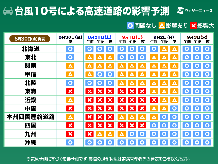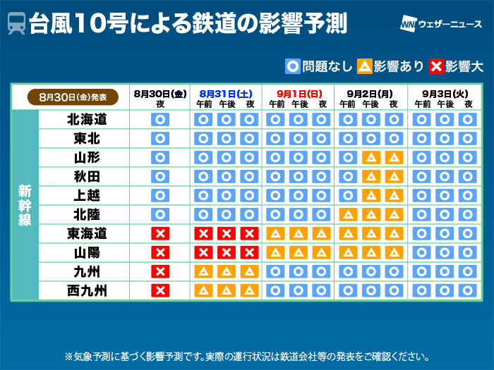 台風10号 交通影響予測 一部区間で交通網ストップ 週明けまで影響が続く可能性も(30日13時更新)