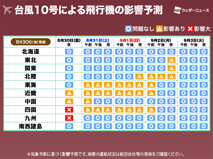31日(土)から9月1日(日)にかけても、すでに一部の空港で欠航が決定されている便があります。