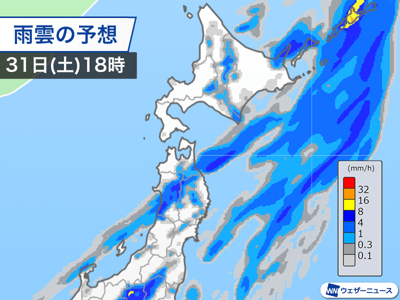 今日31日(土)の北日本は、前線や湿った空気の影響で道南や道央、青森県を中心に激しく雨が降っています。雨の範囲は徐々に東へ移動し、日本海側から天気は回復傾向となる見込みです。