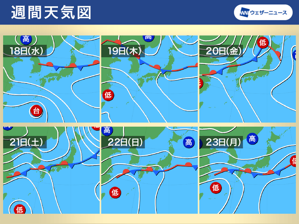 秋雨前線は19日(木)から20日(金)にかけて北日本に北上した後、再び南下。次の三連休初日の21日(土)以降は本州付近に停滞する予想です。