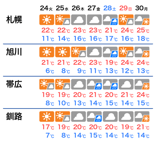 旭川では朝は10℃くらいまで下がる日が多くなる予想です。札幌や旭川の最高気温は20℃から25℃の間で推移し。一日を通して過ごしやすい体感となりそうです。