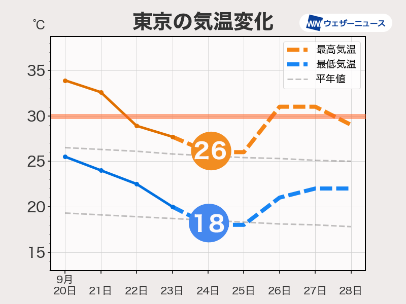 依然として平年よりは高い傾向ではあるものの、連日35℃くらいまで上がっていた頃に比べるとしのぎやすい日が多くなります。最低気温は20℃を下回ることもあり、朝晩は涼しく感じられそうです。