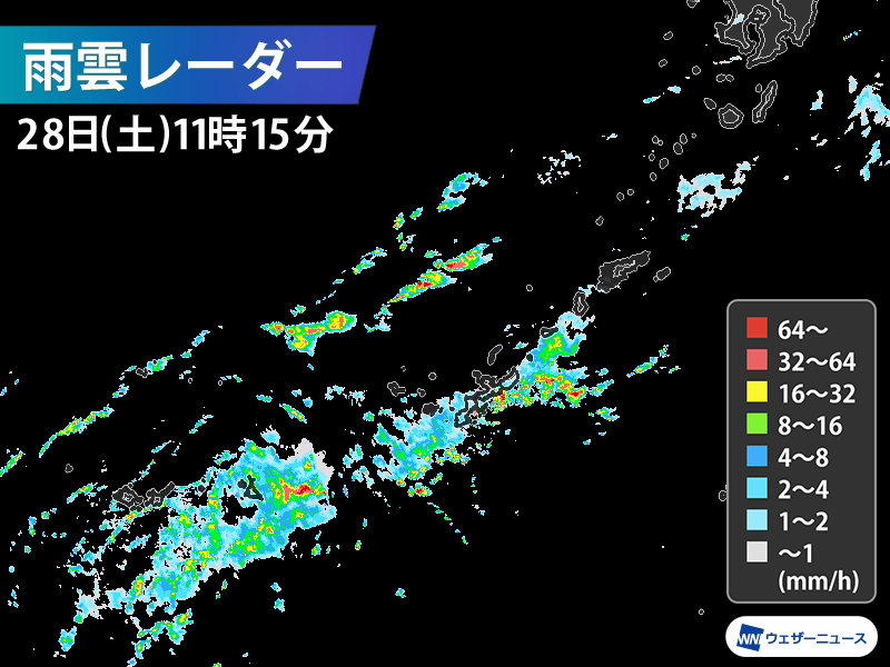 沖縄本島や宮古島の周辺の活発な雨雲が目立ち、11時10分までの1時間には宮古島で12.5mmのやや強い雨。沖縄本島の東村では6.0mmの雨を観測しました。