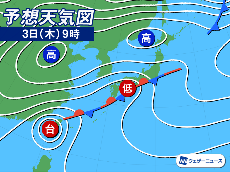 明日3日(木)は低気圧を伴った秋雨前線が徐々に北上します。東北から九州では広く雨が降り、低気圧に近い四国や近畿、東海では局地的に大雨となるおそれがあります。