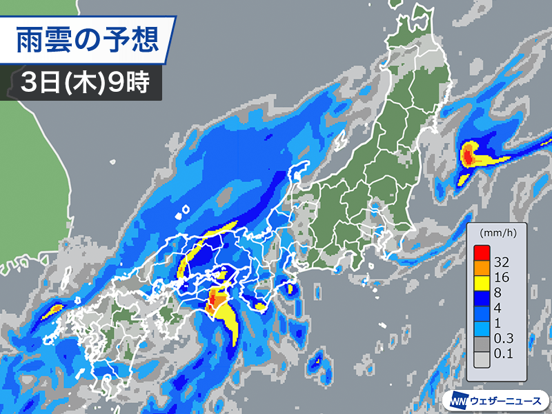 明日3日(木)は秋雨前線が夜にかけて北上し、前線上の低気圧が進んできます。前線に向かって、台風18号周辺の暖かく湿った空気が流れ込む見込みで、 前線活動が活発化する予想です。