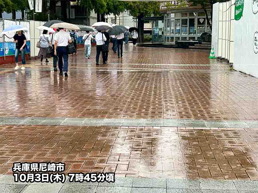 東北~九州の広い範囲で本降りの雨となっていて、低気圧に近い四国や近畿では発達した雨雲が通過し、局地的に雨が強まっています。和歌山県白浜町のアメダス日置川では、8時04分までの1時間に40.5mmの激しい雨を観測しました。