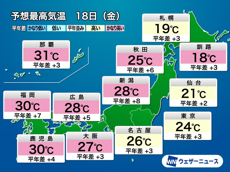 明日18日(金)は移動性の高気圧が北海道東の海上に移動します。西日本や東日本では雲が多いものの、高気圧の縁を周って流れ込む暖かい空気の影響で西日本はムシムシとした暑さとなりそうです。