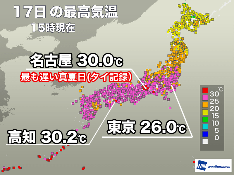 30℃を観測した名古屋では1961年以来最も遅い真夏日のタイ記録となりました。高知(30.2℃)は1998年10月18日に次ぐ2番目に遅い真夏日です。東京の最高気温は26℃でした。