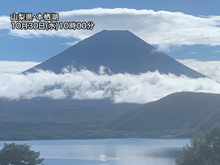 昨日から今朝にかけて雨を降らせた雨雲は弱まり、富士山周辺では天気が回復してきました。静岡県側、山梨県側ともに山頂付近が見えてきています。富士五湖の一つである本栖湖近くから見えた富士山頂には雪は確認できず、初冠雪とはなっていません。