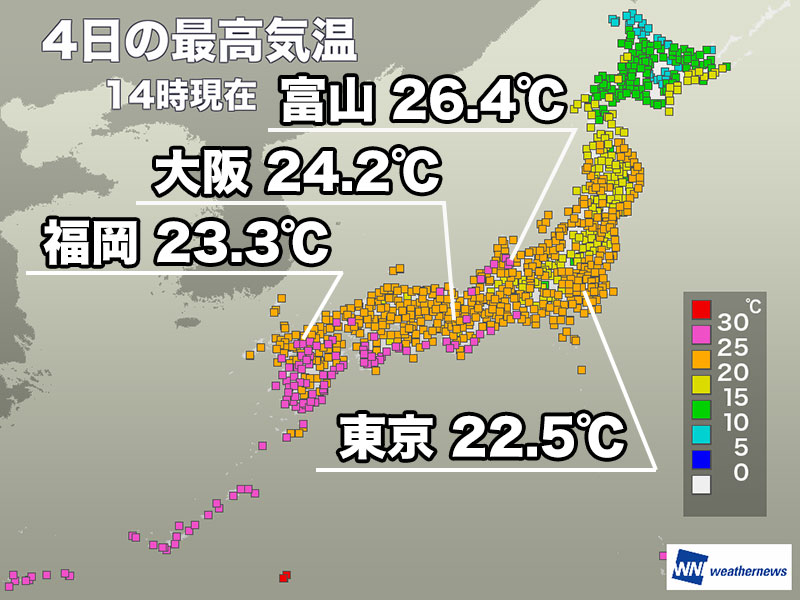 富山や金沢、松山、熊本などで25℃以上の夏日となりました。厚着をしてしまうと日なたでは暑いくらいです。