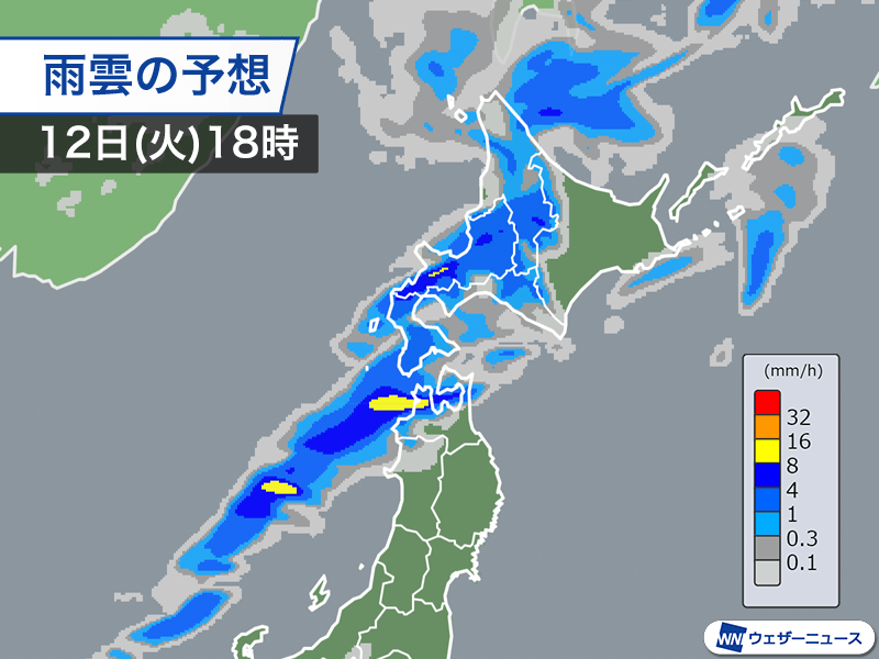 夕方の帰宅時間帯は北海道から東北北部にかけての広い範囲で本降りの雨になります。日本海側の一部では雨雲が発達して強く降る所がある予想ですので、移動のタイミングによっては大きめの傘を準備したほうが良いかもしれません。