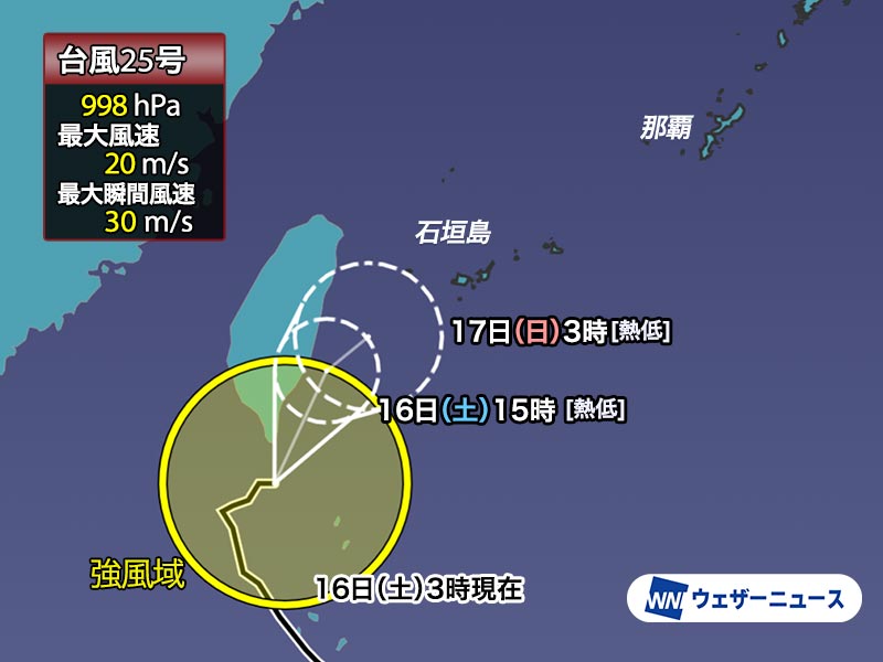 台風25号はフィリピンと台湾の間にあるバシー海峡を進んでいます。今後も勢力を落とし、今日16日(土)には先島諸島の南で熱帯低気圧に変わる見通しです。