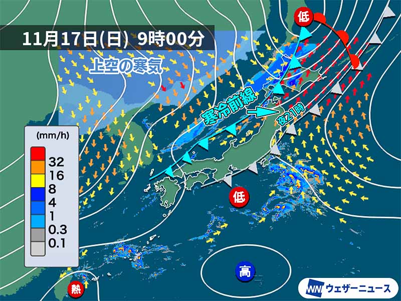 寒冷通過し風雨強まる 通過前は気温上昇、通過後は寒気南下し雪も