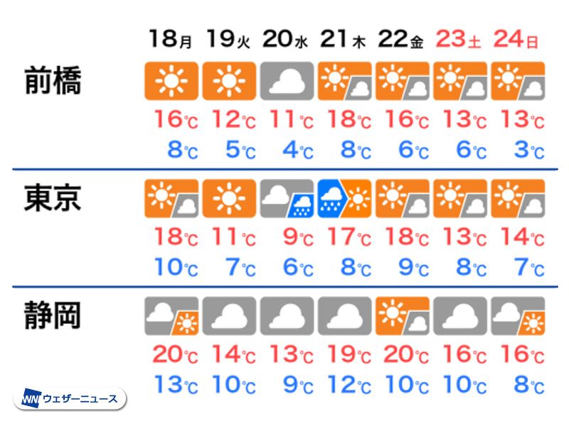 雨に加えて、東寄りの冷たい風が吹き付けるため、気温が上がりません。20日(水)の最高気温は東京都心やさいたま市で9℃、横浜市や千葉市で10℃など、関東南部では1月上旬〜中旬並みになる予想です。