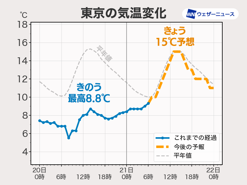 昨日20日(水)は、冷たい雨の降っていた関東では昼間も気温が上がらず、最高気温が10℃に届かなかったところが多くなりました。