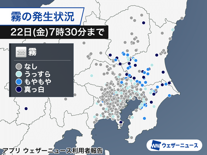 ウェザーニュースアプリ利用者からの報告を見ると、関東でも東側のエリアで濃い霧の発生しているところが多く、東京都心周辺ではほとんど霧の報告はありません。7時30分現在、関東地方全域に濃霧注意報が発表されており、一部の高速道路では霧のため速度規制をしている区間があります。